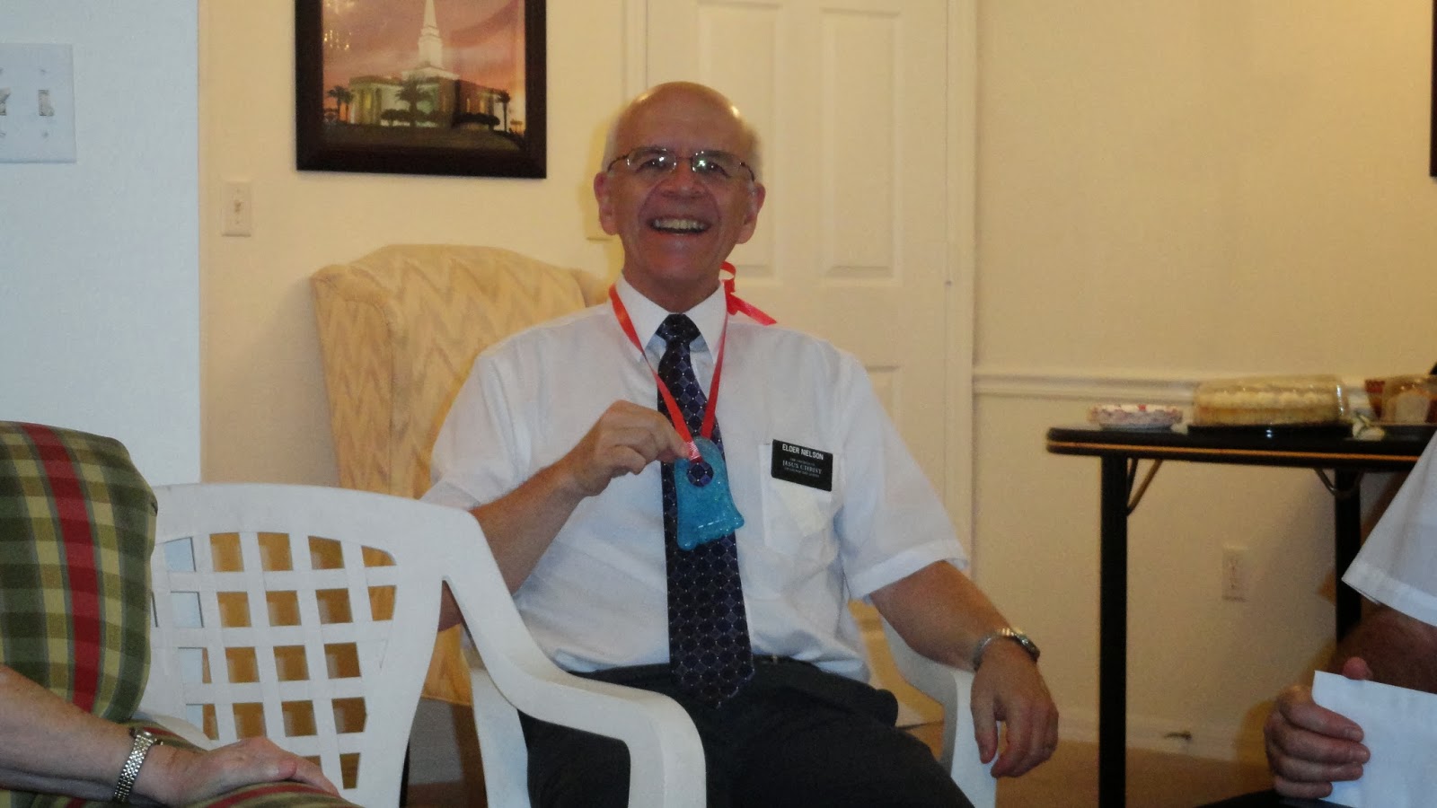 It was actually a little blue plastic, foot shaped teething toy, but Elder Nielson wore it humbly around his neck during the course of our entire Senior Missionary District Meeting.